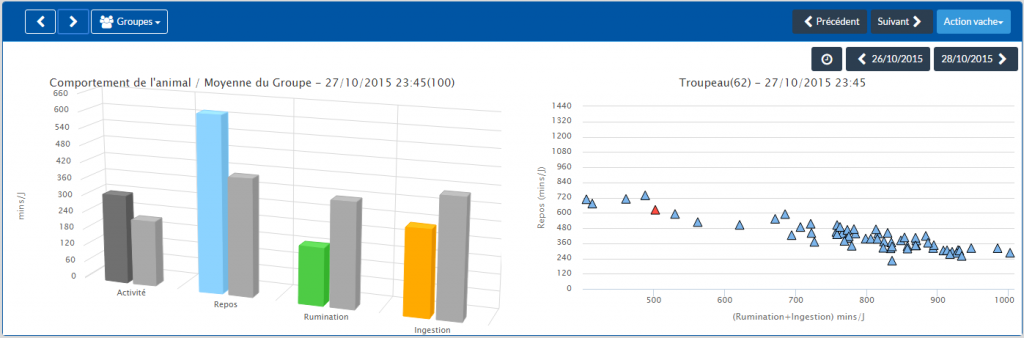 En cas d’anomalie, sur un ou plusieurs indicateurs (rumination, ingestion, intensité de l’activité, repos), l’éleveur reçoit une alerte comportement et peut intervenir rapidement sur les animaux à problèmes. L’impact de cette rapide intervention sur la production laitière et l’expression des chaleurs est non négligeable.