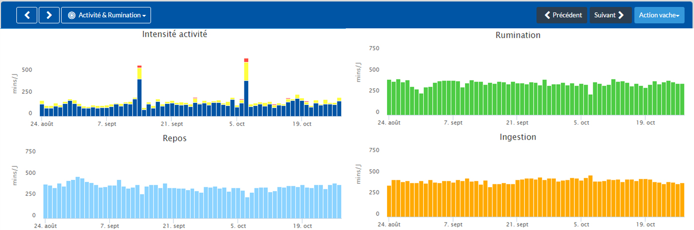 - L’activité, le repos, la rumination et l’ingestion de l’animal sélectionné sont comparés avec les niveaux d’activité, de repos, d’ingestion et de rumination moyens du troupeau