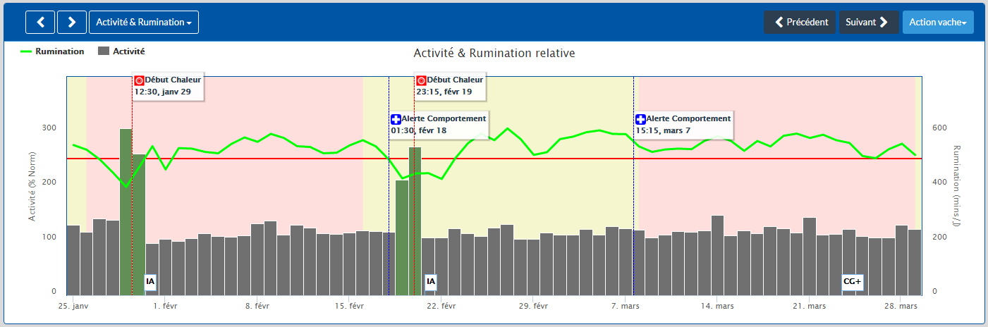 L’éleveur est informé du démarrage des chaleurs avec une précision au ¼ d’heure près quant à l’heure de début de celles-ci. La visualisation des courbes permet de valider la cyclicité de l’animal. Pour une adaptation fidèle aux comportements des animaux, il est possible de séparer les vaches et les génisses en créant des groupes distincts ainsi que de paramétrer le seuil de détection.